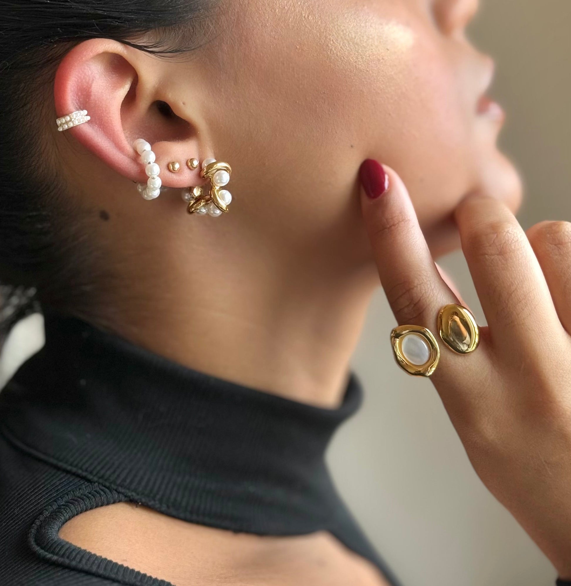 O brinco Marcela ilumina o rosto sem competir com outro acessório.